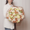 Warm, grounded, and effortlessly stylish—Mocha is where elegance meets edge. Featuring toffee, cream, and blush baby roses accented with white hypericum and soft yellow stock, this bouquet channels modern sophistication with an organic soul. It’s the perfect blend of calm luxury and bold charm.