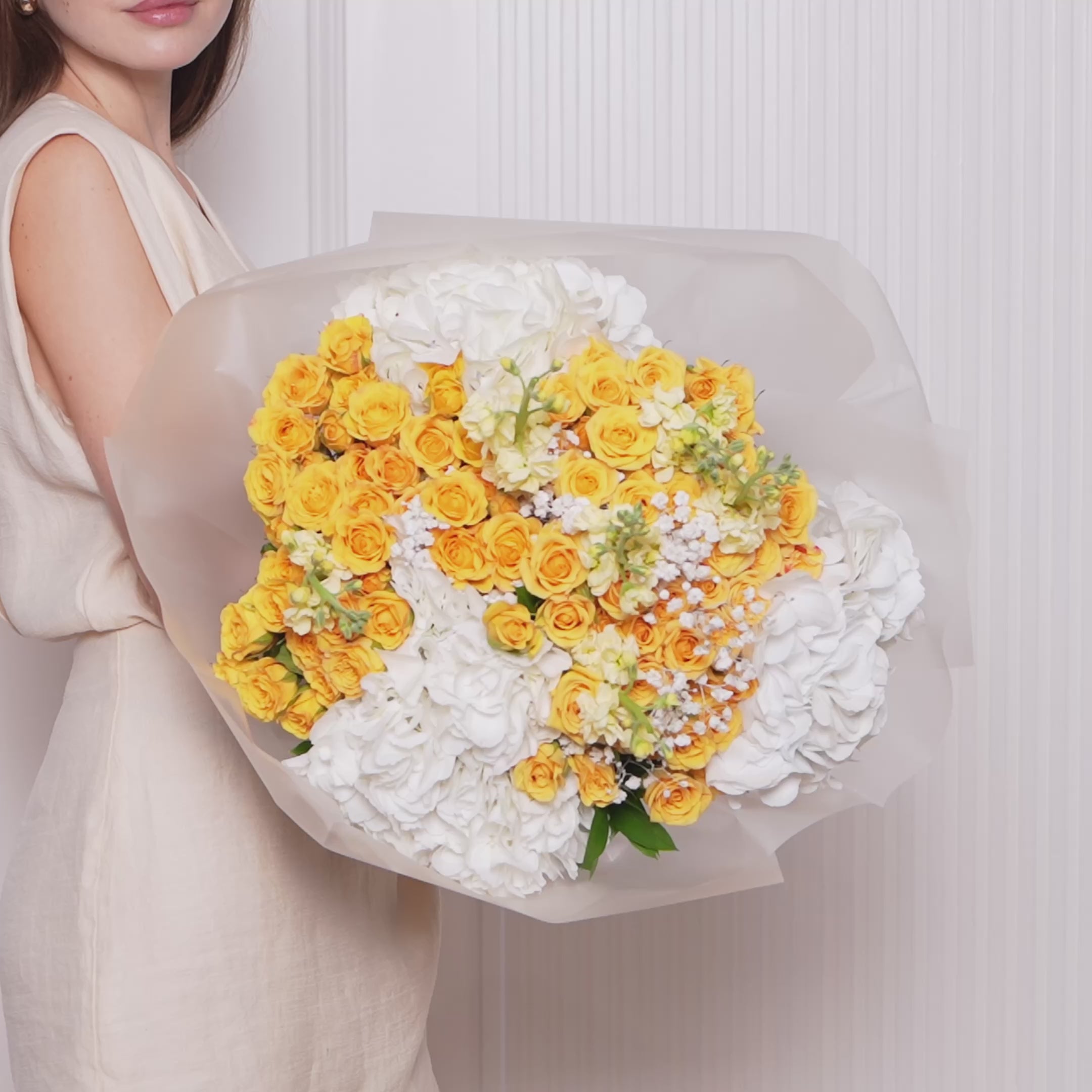 Bright, graceful, and full of light—Clarisse blends golden baby roses with lush white hydrangeas and delicate fillers for a look that’s both fresh and uplifting. It’s a bouquet that radiates joy and refinement, perfect for milestones, celebrations, or simply saying, “You are cherished.”