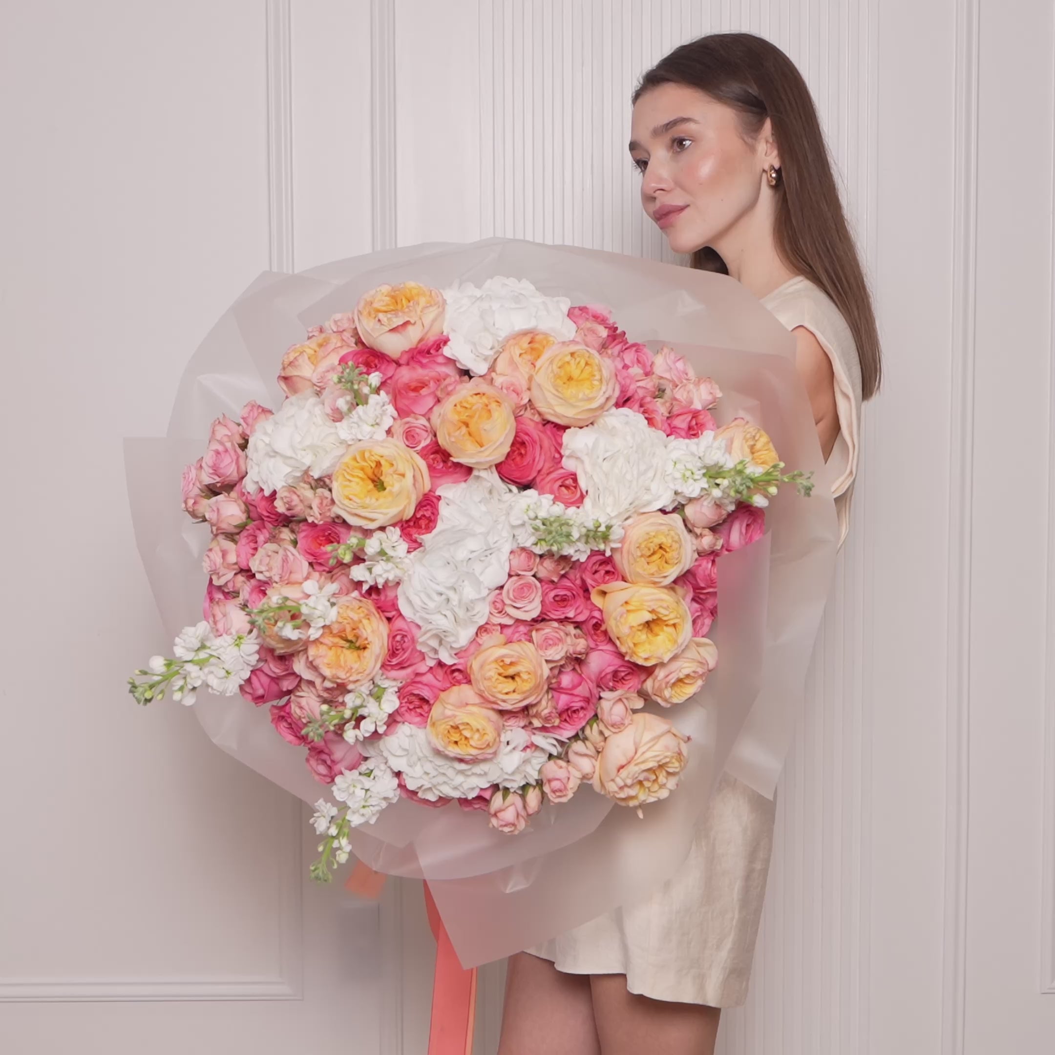 Glowing with warmth and romance, Aurelia is a dazzling mix of apricot and coral garden roses, blush baby roses, and snowy hydrangeas accented with delicate stock. It’s a bouquet that radiates golden joy and modern elegance, perfect for milestones, anniversaries, or unforgettable declarations of love.