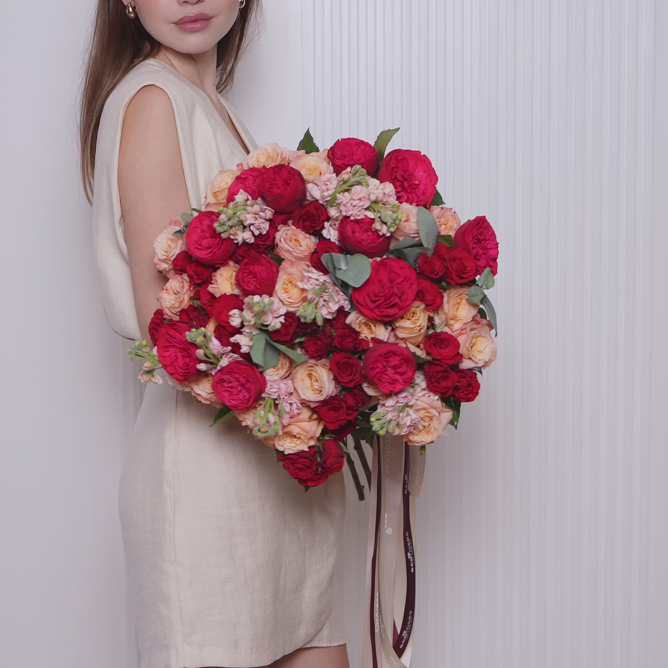 Vibrant and full of life, Allegra is a celebration in bloom. Featuring fiery red garden roses, soft peach roses, and delicate stock with touches of eucalyptus, this bouquet is crafted to inspire joy, passion, and unforgettable memories. Perfect for grand gestures and heartfelt celebrations.