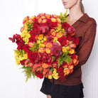 Bold. Fiery. Unapologetically passionate — Vesper sets the room ablaze. Featuring a striking medley of classic red roses, orange-red spray roses, golden-yellow baby roses, and vibrant solidago, this bouquet is elevated with crimson-tinted eucalyptus for dramatic depth. Designed for grand entrances, fearless love, and unforgettable moments.
