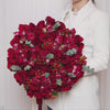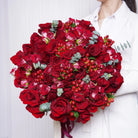 A luxurious hand-tied arrangement featuring 50 premium red roses, vibrant baby roses, rich red hypericum berries, and fresh eucalyptus for a touch of texture and greenery. “Valentina” is a bold expression of love, elegance, and timeless romance.
