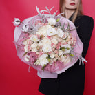 Wrapped in a pale winter-pink finish, this arrangement delivers a refined, romantic holiday mood—gentle, elegant, and unmistakably premium. Perfect for gifting, seasonal décor, and sophisticated winter celebrations.