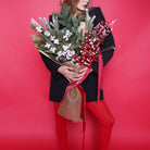 Snowdrift captures the essence of winter in its purest form. Frost-tipped evergreens, soft cotton blooms reminiscent of fresh snowfall, and vibrant red holiday berries come together in a bold, sculptural arrangement that defines the season. Wrapped in natural burlap with a deep red ribbon, this piece delivers elevated Christmas energy—clean, modern, and unmistakably luxurious.