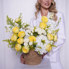 Luce del Mattino (“Morning Light”) brings the essence of a sunlit Tuscan morning into any space. A graceful composition of buttery yellow garden roses, crisp white blooms, and cloudlike hydrangeas, it’s designed to uplift, refresh, and inspire. Ideal for new beginnings, warm welcomes, or simply brightening someone's day with refined elegance.