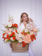 Arancia di Luce (“Orange of Light”) is a sun-drenched celebration of golden fields and ripened citrus. Featuring vibrant orange roses, creamy dahlias, soft blush stock, and cascading cymbidium orchids, this lush composition is grounded in the rustic elegance of a woven basket. A luminous arrangement perfect for grand entrances, joyful occasions, or heartfelt gestures — where abundance meets radiance.