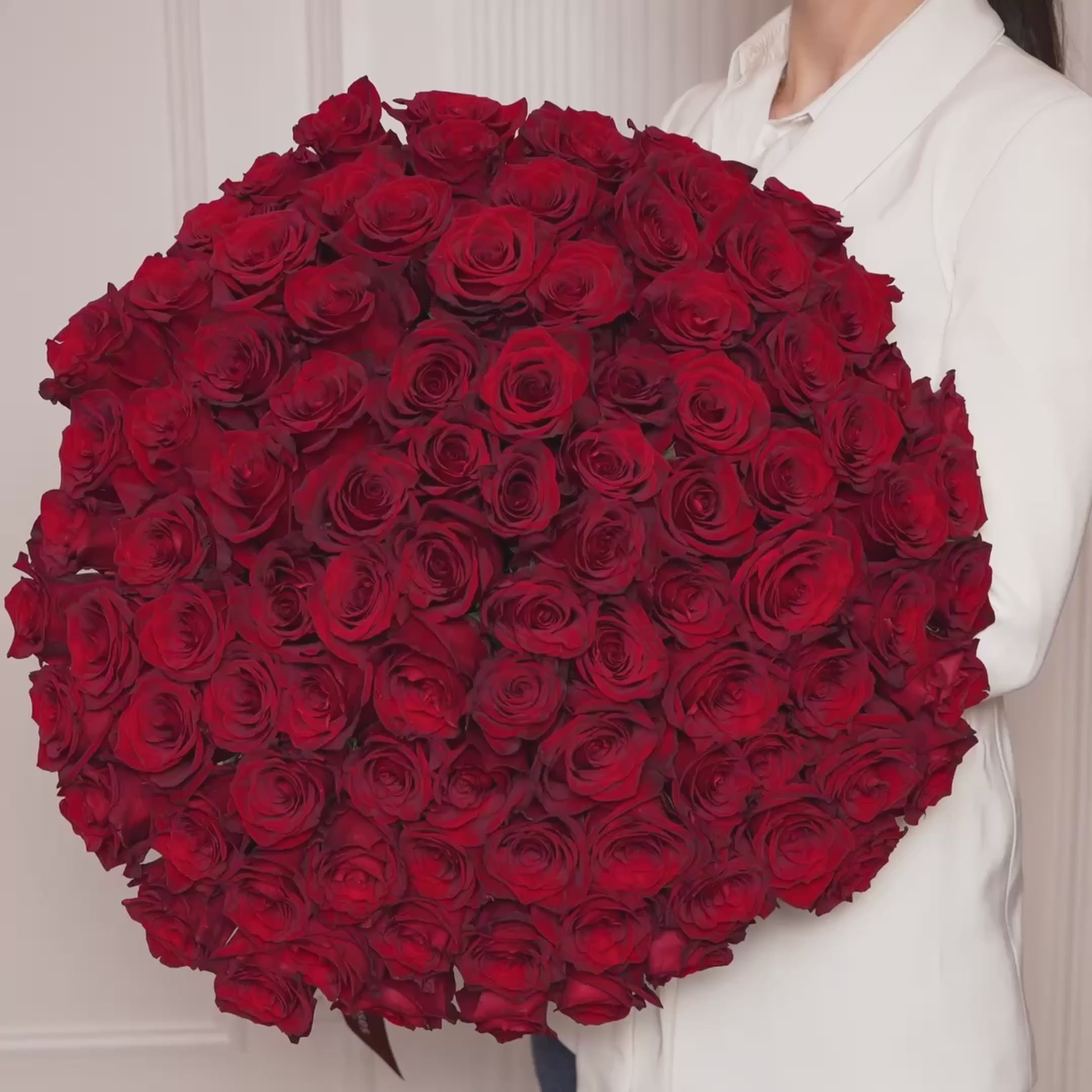 Make a breathtaking statement with Scarlett—an unforgettable display of 100 deep red long step roses, meticulously arranged to exude luxury, devotion, and power. This bouquet doesn’t whisper love... it declares it. Designed for grand entrances, bold gestures, and once-in-a-lifetime moments.
