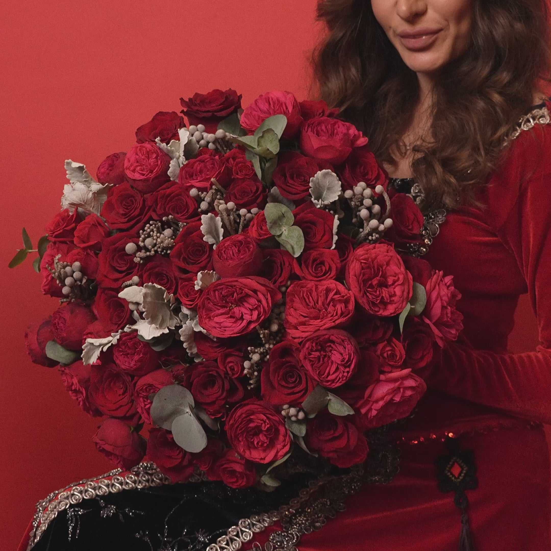Ripsime reflects spiritual beauty and quiet strength. This bouquet features velvety deep red roses paired with cool silver accents—brunia, dusty miller, and eucalyptus—creating a dramatic yet serene composition. Perfect for refined occasions, elegant gestures, and moments of meaning.